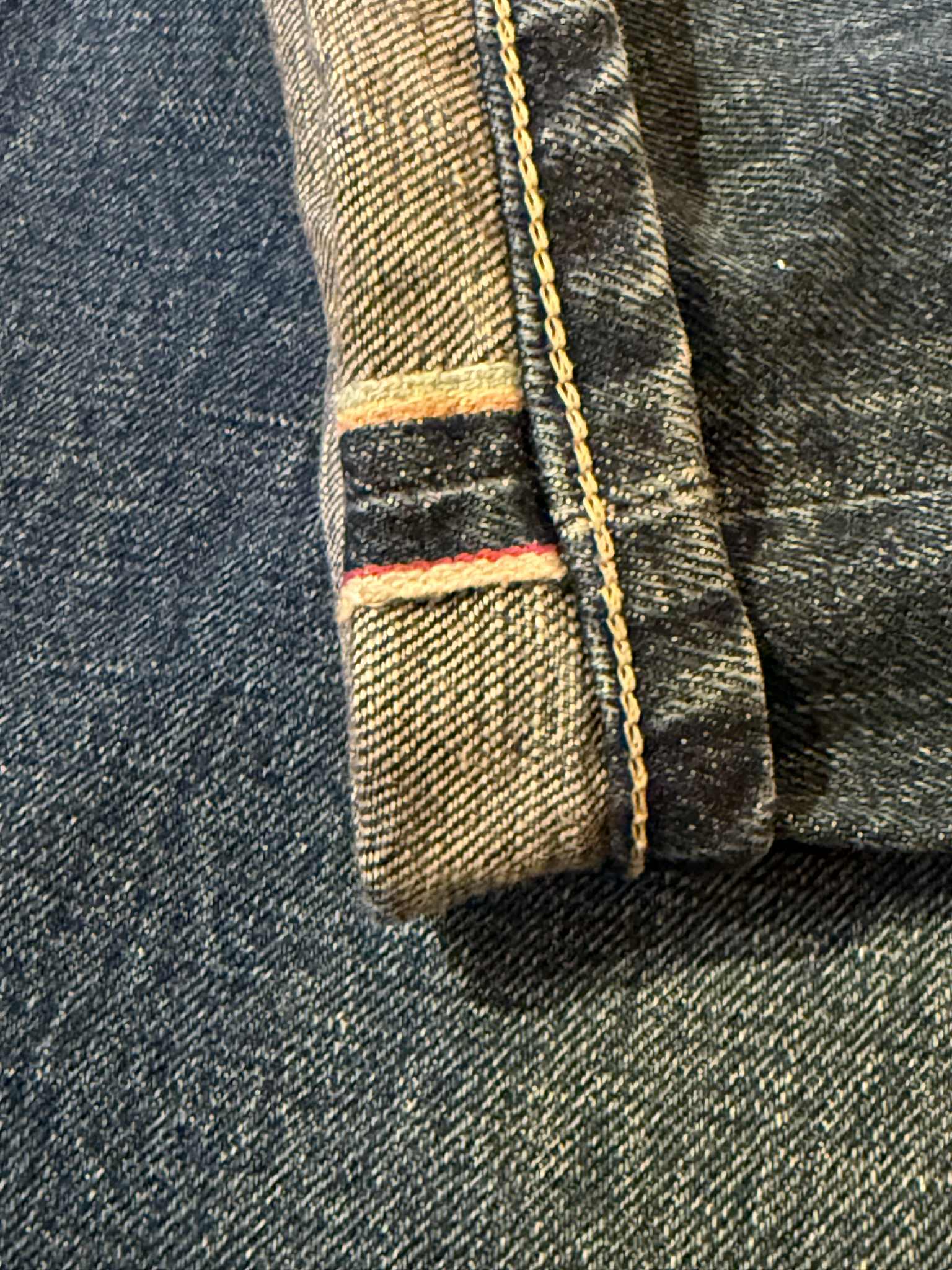 These EDWIN "Rebel Vintage" Jeans are expertly crafted in Japan, weighing 12.8oz for durable wear. Featuring unique rainbow selvedge details and a universal zipper, they showcase a slim straight silhouette for a modern yet timeless fit. Perfect for those who appreciate quality craftsmanship and distinctive denim accents.