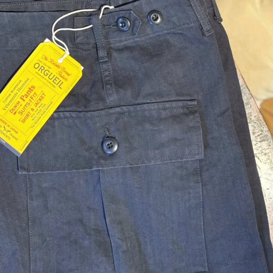 These Orgueil Army Trousers draw inspiration from the iconic 1940s military M-43 herringbone design, crafted from durable, heavy herringbone cotton fabric. Featuring a wide silhouette that tapers subtly, they offer a balanced fit accented by nut buttons. Functional large side pockets add practicality, while the 100% cotton construction ensures comfort and breathability. Proudly made in Japan, these trousers combine heritage craftsmanship with timeless military style.
