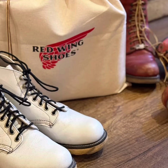 This canvas bag, made in the USA by Red Wing Shoes, is specifically designed to fit all Red Wing boots sized between 6" and 8". Constructed from durable canvas material, it features Taslan laces used as a puller for secure and easy closure, providing practical protection and convenient transportation for your boots.