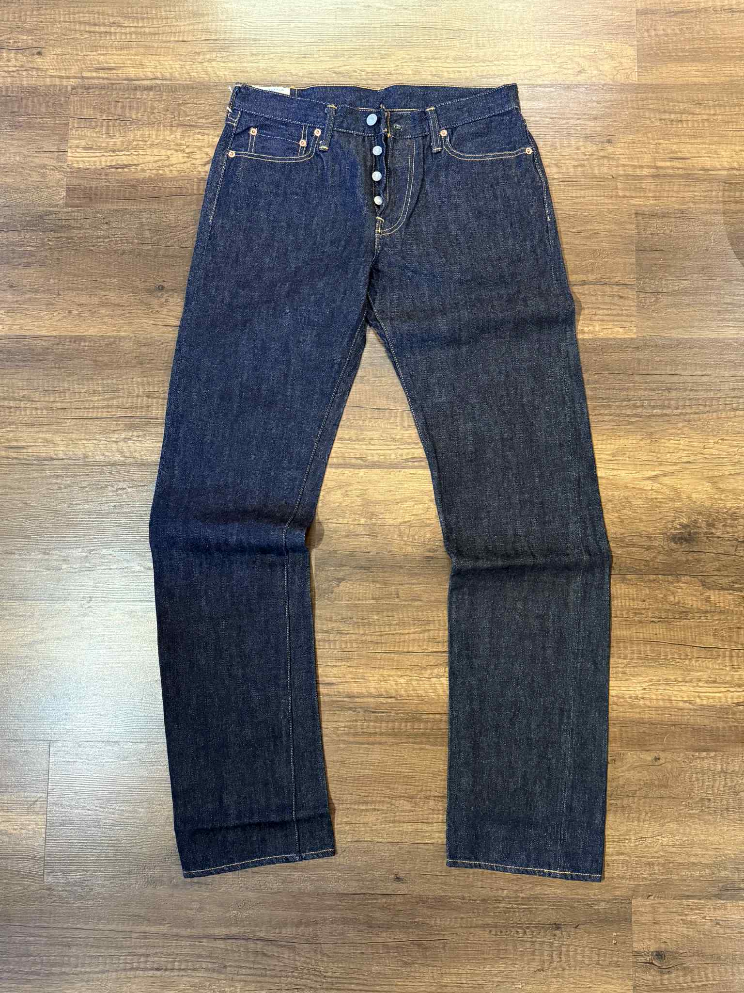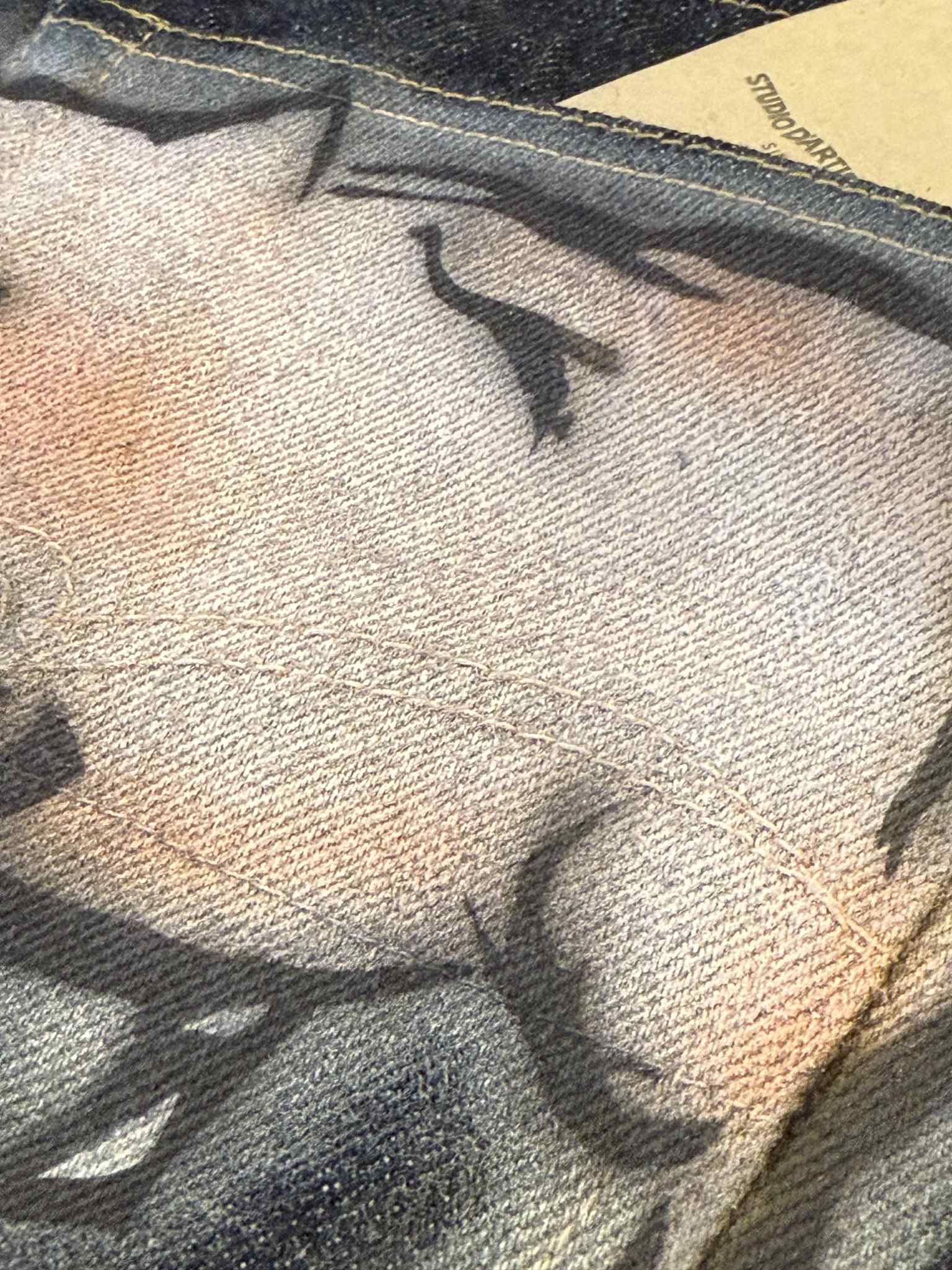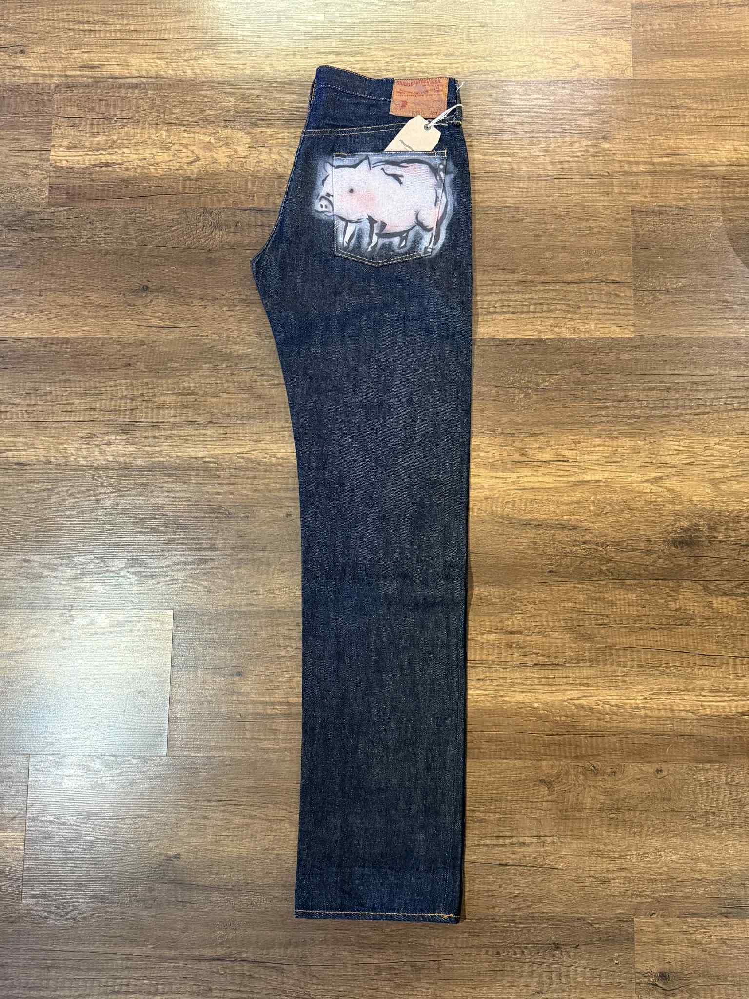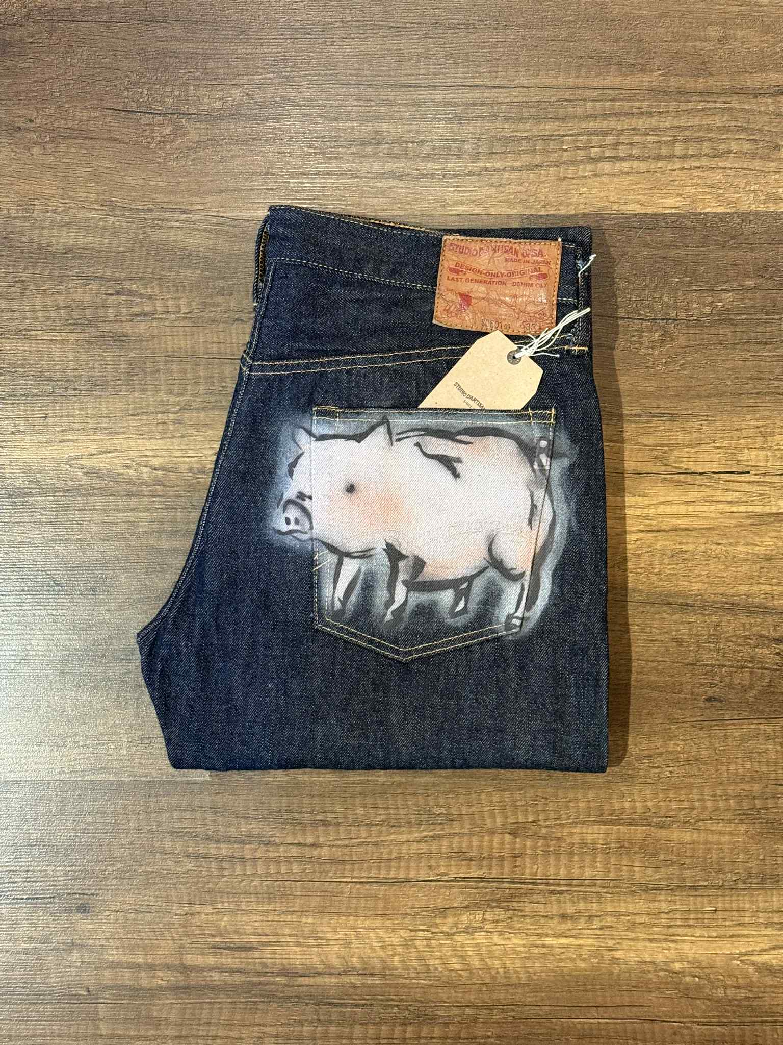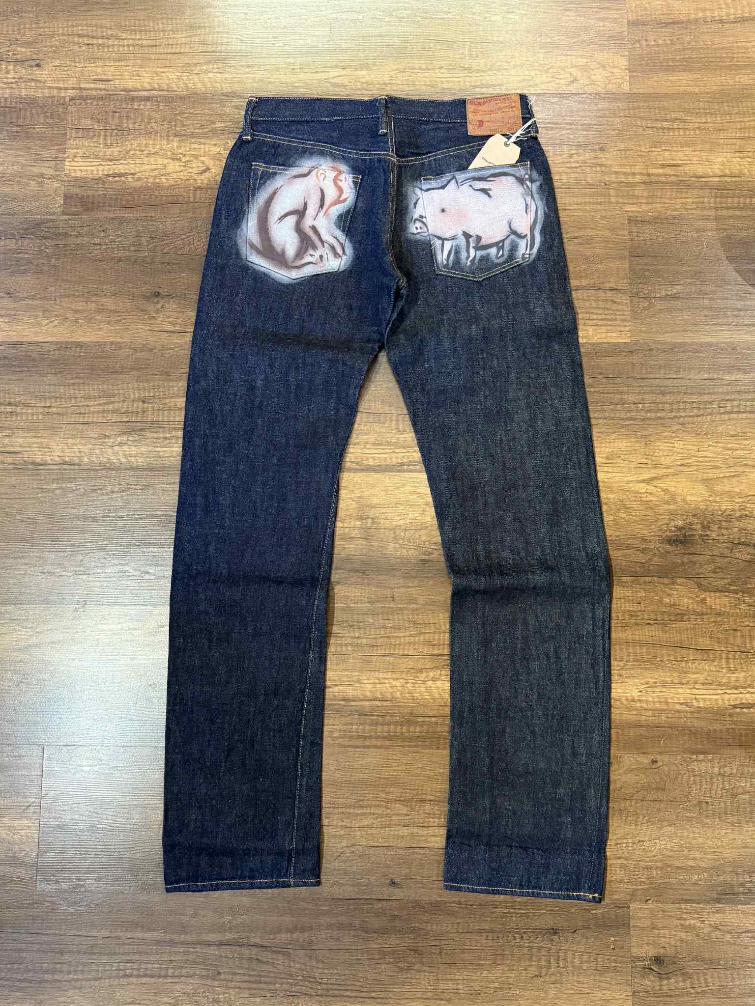 The Studio D'Artisan "Monkey" Zodiac Series Jeans are a limited edition piece from a personal collection, crafted from 100% Japanese cotton for exceptional quality and durability. Featuring tight straight cutting for a tailored fit, these jeans stand out with distinctive spray-painted monkey and piggy motifs on the back pockets, adding unique character to a classic silhouette. Ideal for enthusiasts seeking both craftsmanship and subtle artistic expression in premium denim.