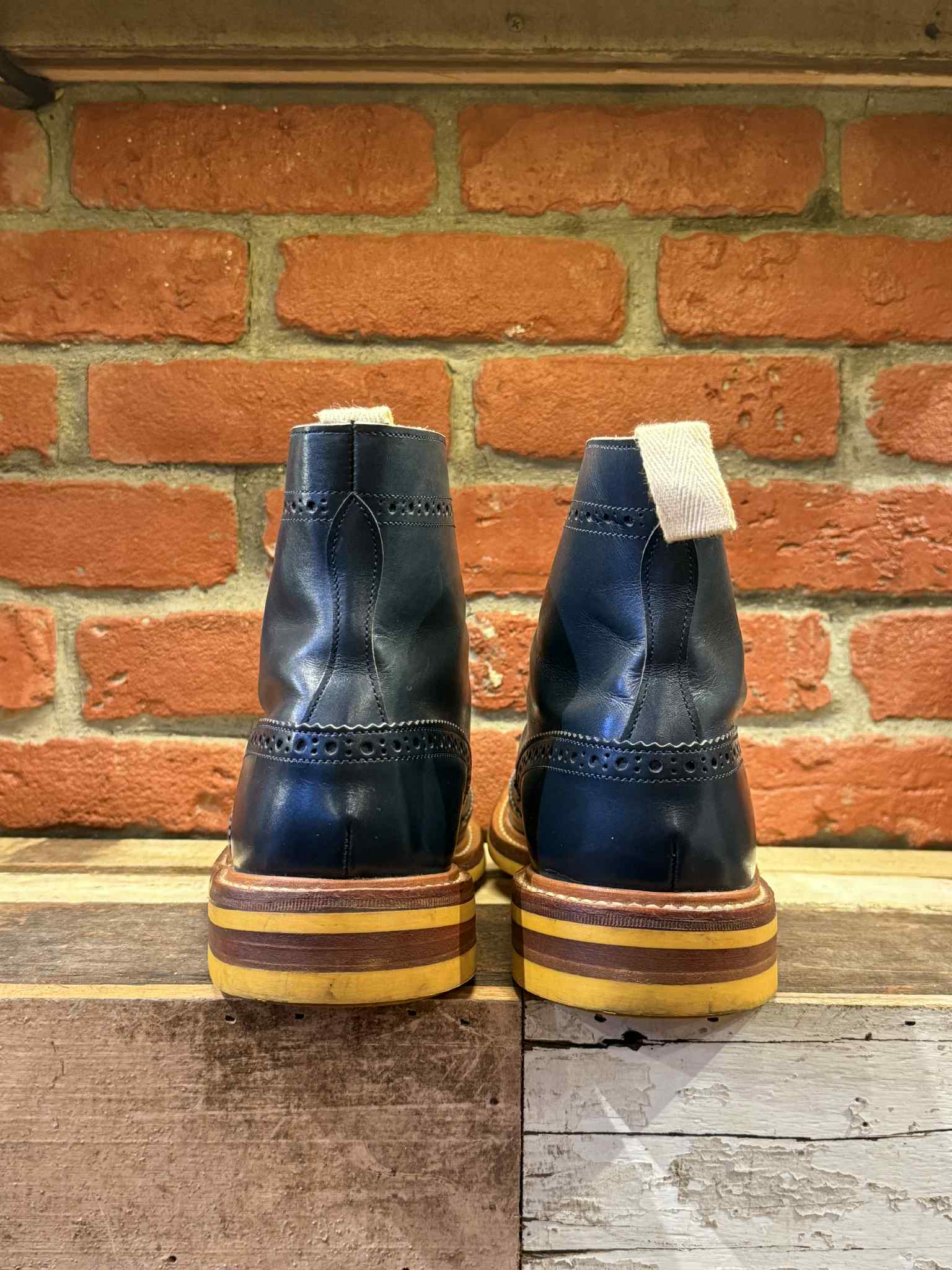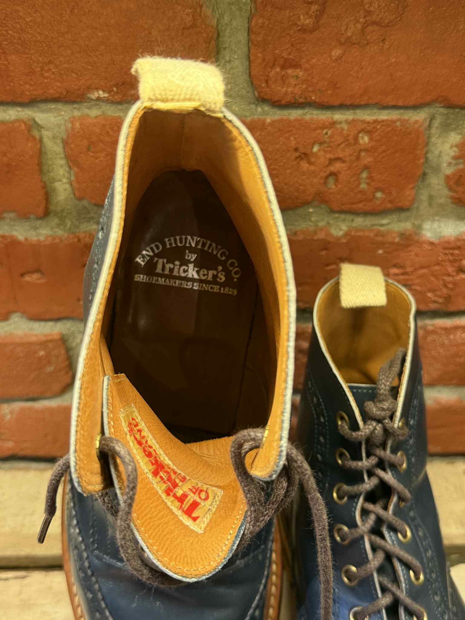 Trickers and End Hunting Co. have come together to create some beautifully crafted Stow Brogue boots. The Tricker's x End Hunting Co Stow Brogue Boots are handmade in England and are available in extremely limited quantities. The boots have premium Cavalier leather uppers, contrasting Dainite soles,good year welted soles and brass eyelets. Here is the Navy Aniline & Empire Yellow colorway.