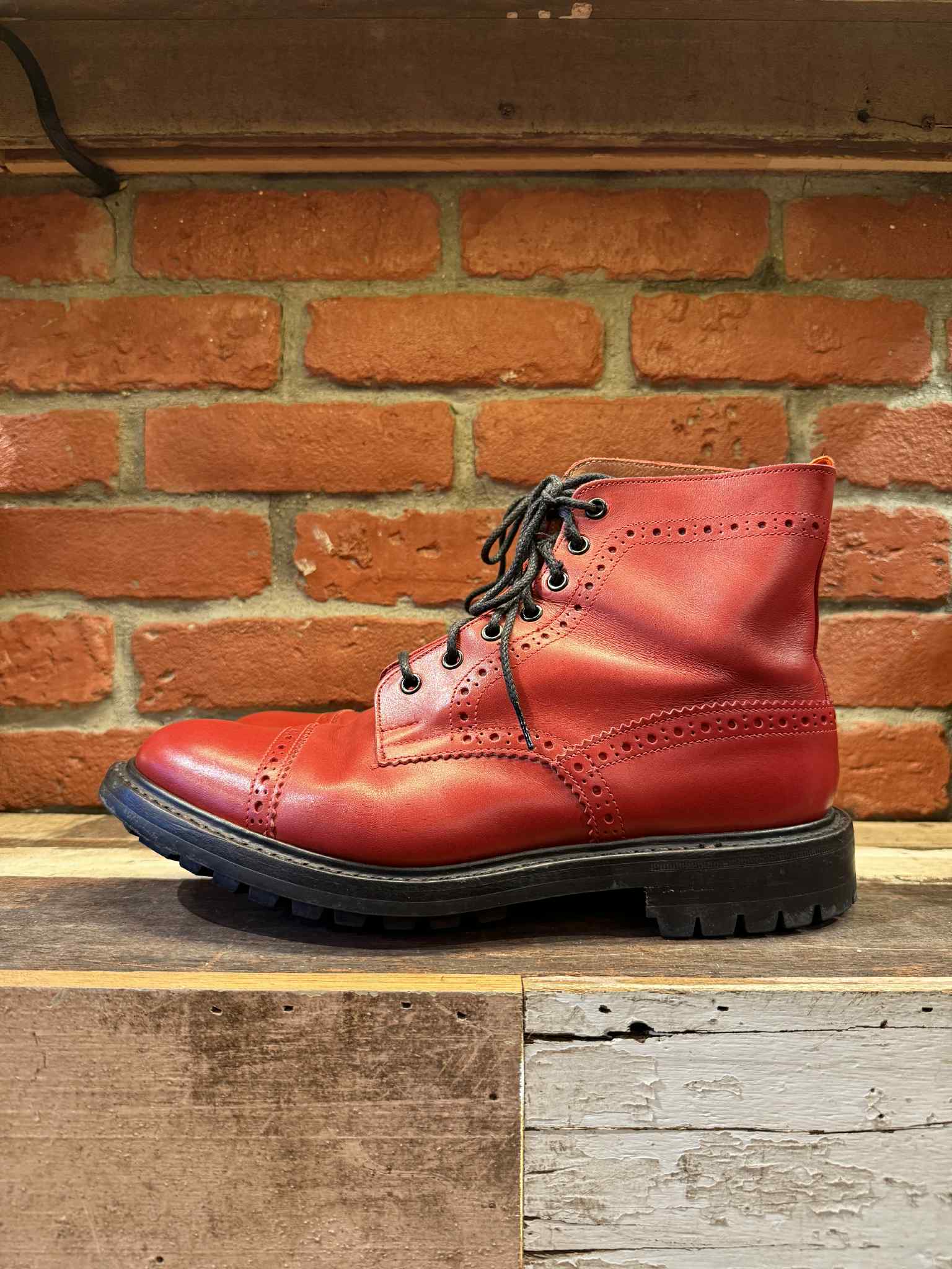 These Tricker's x JUNYA WATANABE Stow Country Boots blend expert craftsmanship with refined design. Crafted in the UK, they feature red cherry aniline leather uppers paired with a durable commando sole, offering both style and traction. The storm welt construction enhances water resistance, while rolled waxed laces add a classic finishing touch. A distinguished collaboration from the personal collection, these classic brogue boots are a sophisticated choice for those seeking quality and heritage.