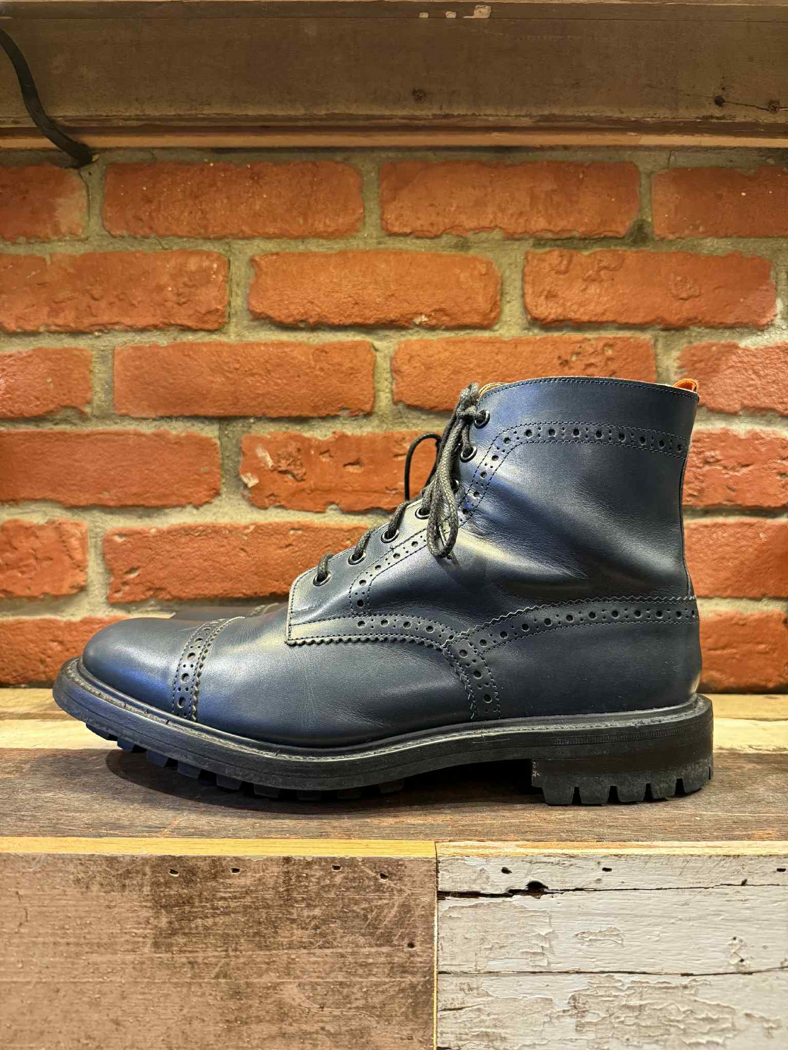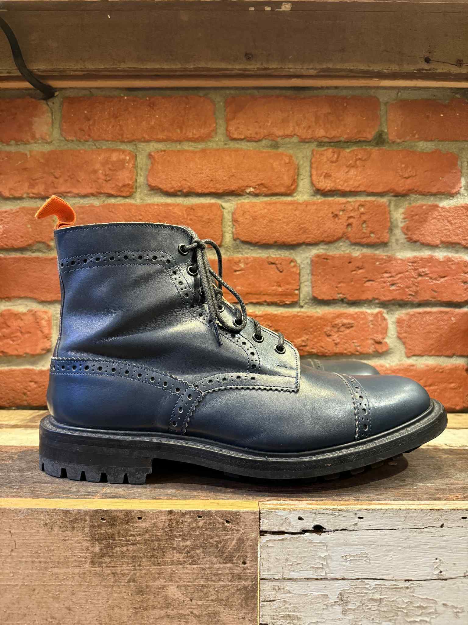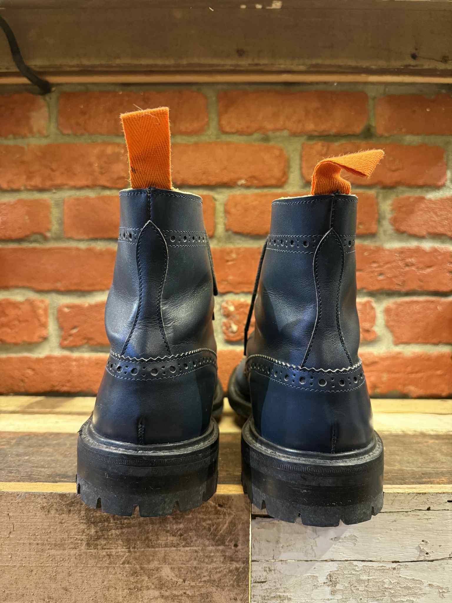 These Tricker's x JUNYA WATANABE Stow Country Boots blend expert craftsmanship with refined design. Crafted in the UK, they feature navy aniline leather uppers paired with a durable commando sole, offering both style and traction. The storm welt construction enhances water resistance, while rolled waxed laces add a classic finishing touch. A distinguished collaboration from the personal collection, these classic brogue boots are a sophisticated choice for those seeking quality and heritage.