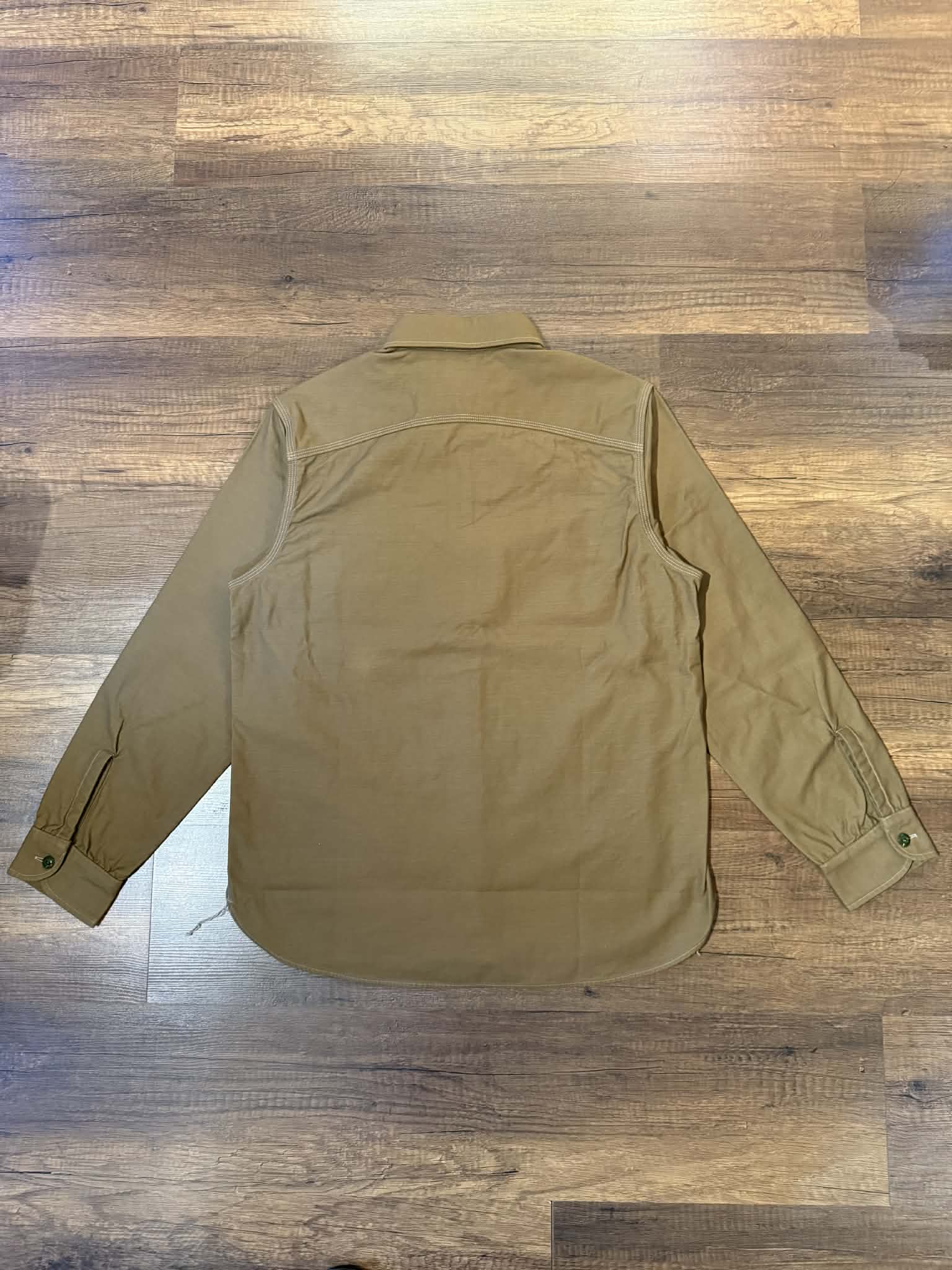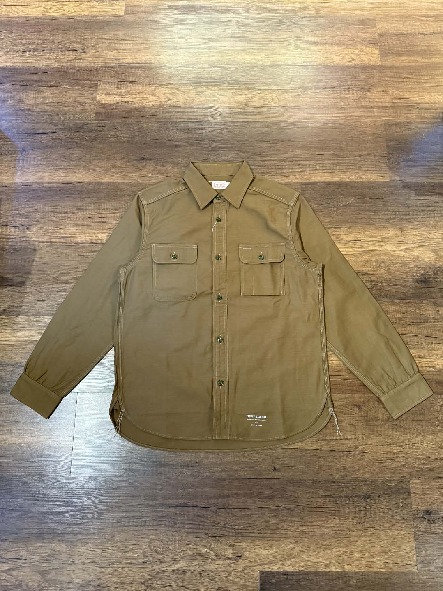 Trophy Clothing "Harvest" shirt features reversed back satin with intentionally visible uneven weft threads that grow more pronounced with each wear, developing character over time. Its tailored silhouette—moderately fitted through shoulders and body with versatile length for tucking or wearing loose—balances contemporary design with timeless appeal.